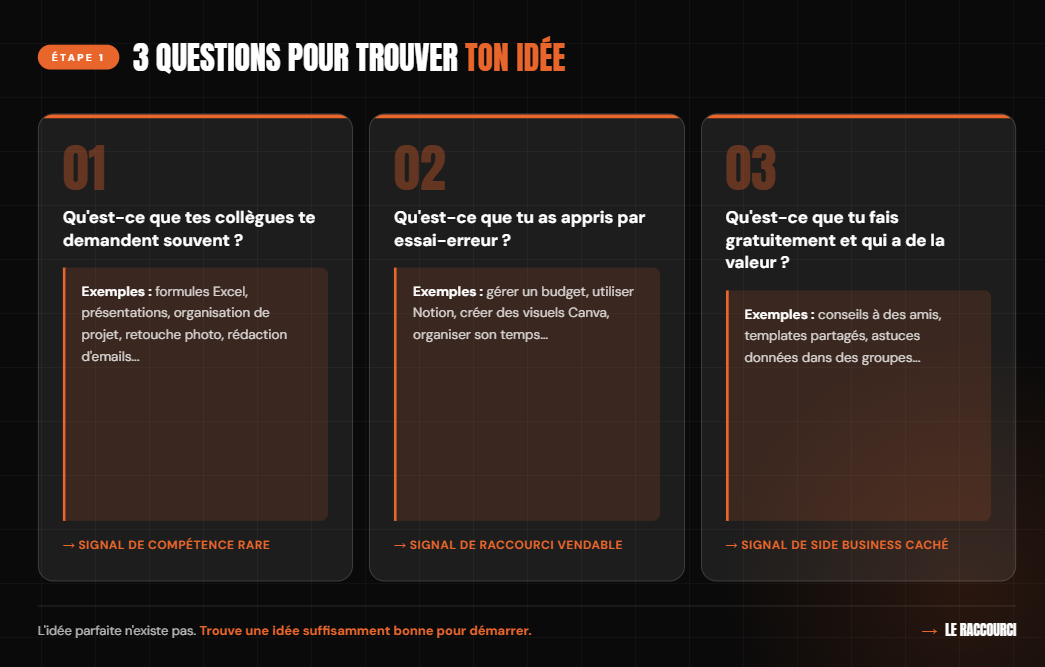 Qu'est-ce que tu fais gratuitement et qui a de la valeur ? Si tu aides déjà des gens (conseils, templates, astuces) sans te rendre compte que c'est un service, c'est exactement là que se cache ton side business.