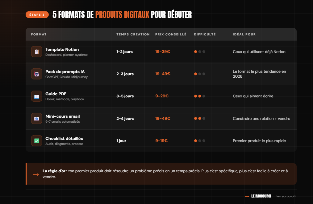 Le format le plus simple pour un salarié qui débute, c'est le produit digital. Plus précisément : un template Notion, un pack de prompts IA, un guide PDF, un mini-cours par email, ou une checklist détaillée. Ces formats ont trois avantages : ils se créent vite, ils ne coûtent rien à produire, et ils se livrent automatiquement.