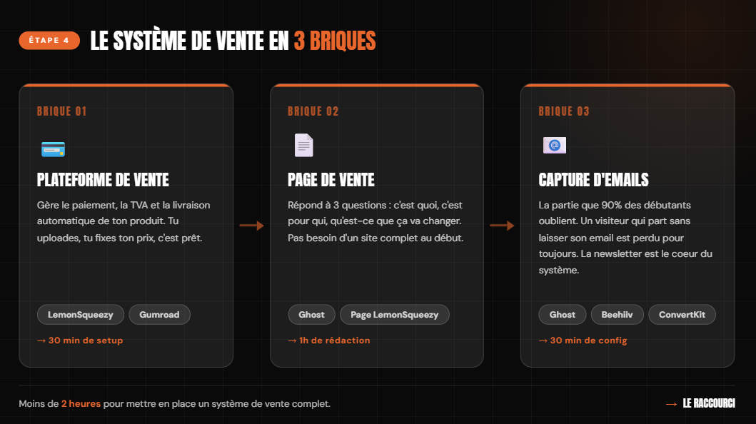 Tu as un produit. Maintenant il faut que les gens puissent l'acheter. La bonne nouvelle : en 2026, tu peux mettre en place un système de vente complet en moins de 2 heures.