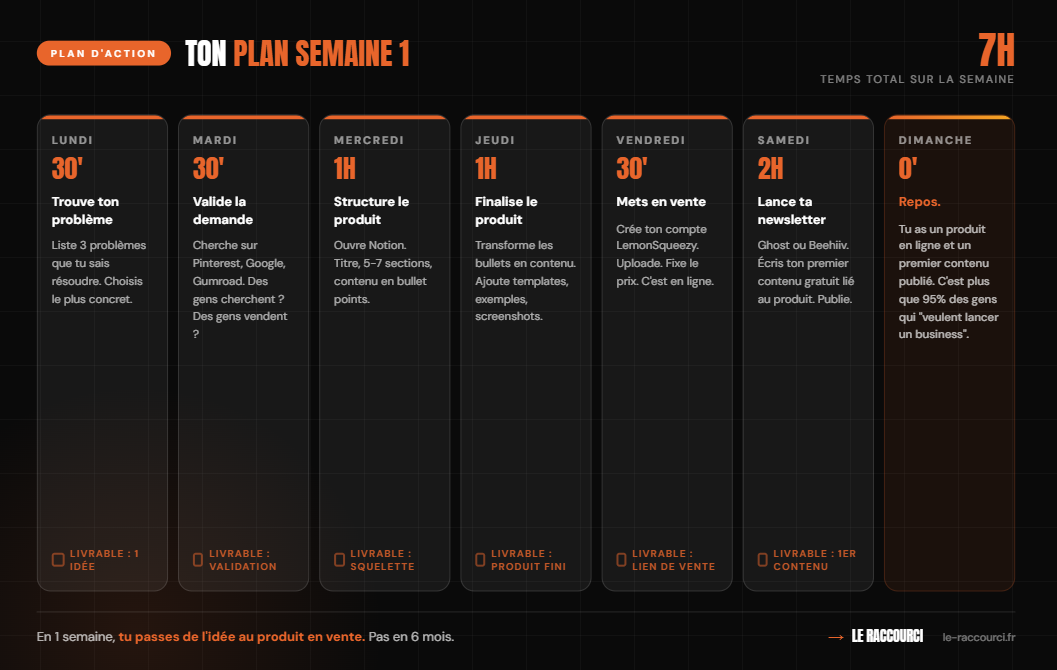 Mercredi soir (1h) : commence ton produit. Ouvre Notion et crée la structure. Un titre, 5-7 sections, le contenu de chaque section en bullet points.